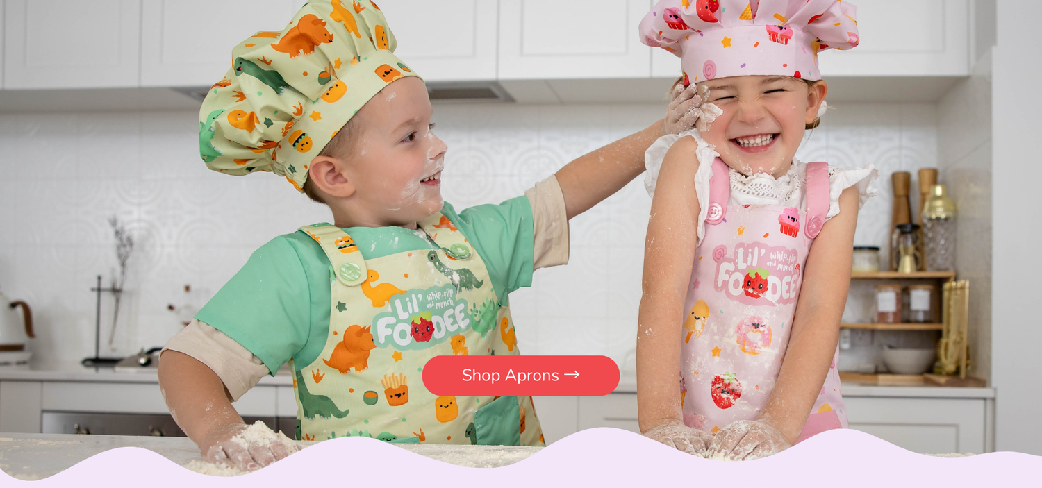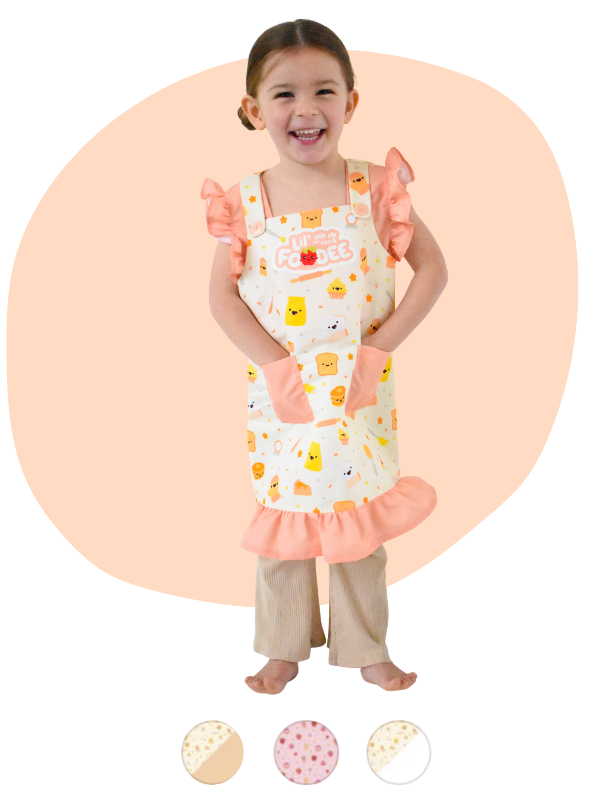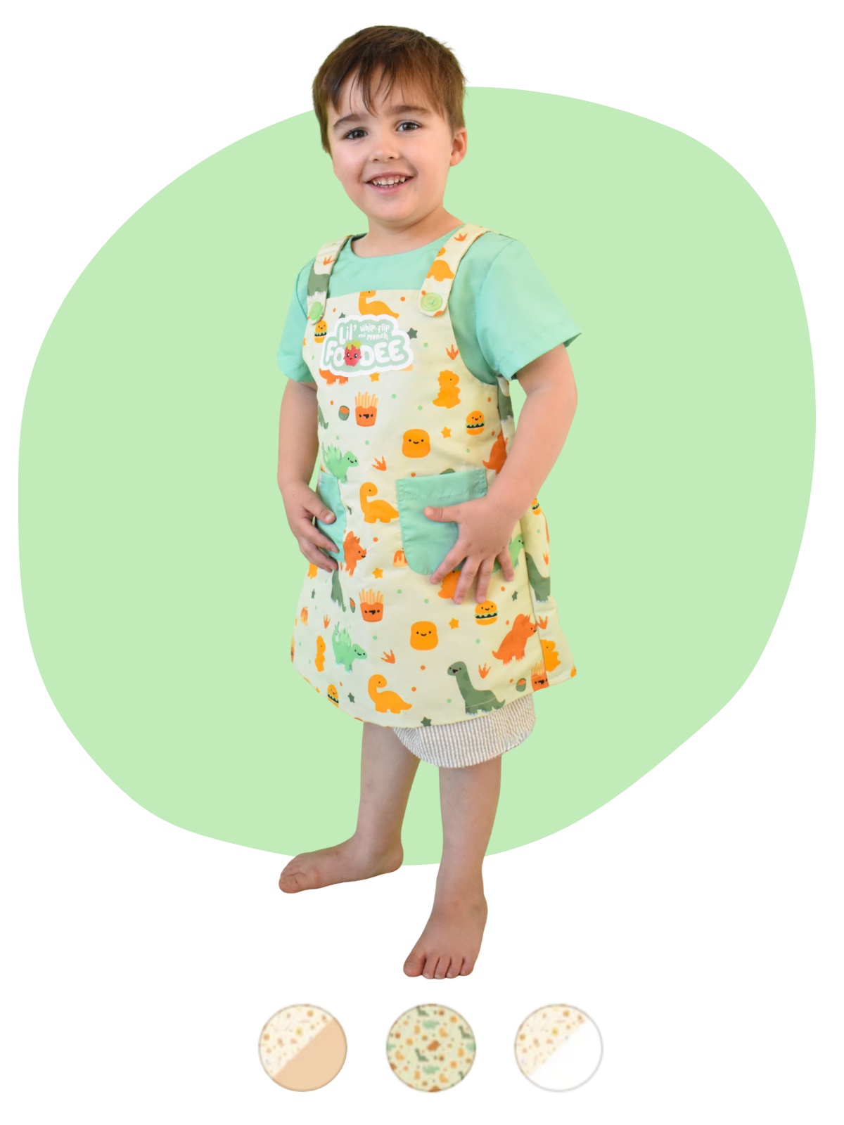 Our aprons are wipe-clean, independence-friendly and comfy enough for everyday play. Choose the style and pattern that fits your little foodie's vibe.
