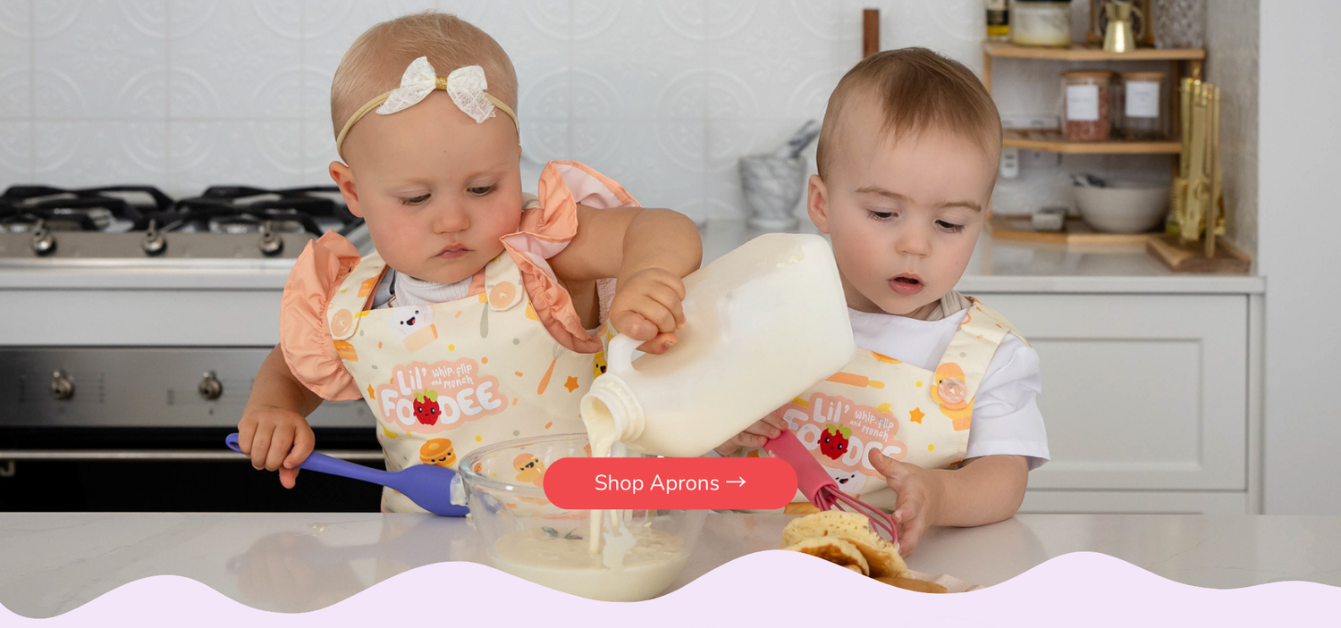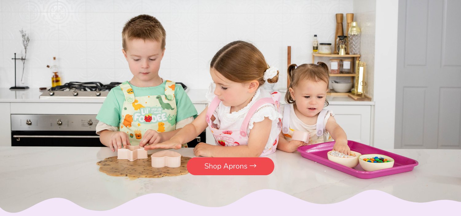 Our aprons are wipe-clean, independence-friendly and comfy enough for everyday play. Choose the style and pattern that fits your little foodie's vibe.